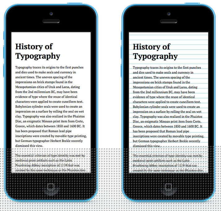 很多時候我們在縱向排版的韻律確定后就會迫不及待地去折騰顏色、柵格甚至布局。搞清楚柵格系統(tǒng)里的節(jié)點確實重要,但是你不能因此無視響應(yīng)式排版,根據(jù)屏幕尺寸調(diào)整垂直排版的韻律感同樣需要琢磨。在移動設(shè)備上使用與桌面端一模一樣的字號和字距就和使用同一套柵格一樣荒謬。無線端和桌面端的區(qū)別極大,其上的閱讀體驗也大不相同。