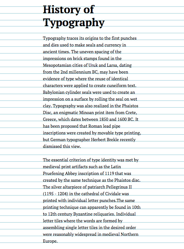 在我的設(shè)計中,文章段落的字號和行高分別是18px/1.77 (也就是32px)。我參照黃金比例來調(diào)整標(biāo)題的字號,也就是說H1現(xiàn)在是3ems(54px)。下面是我定義的不同字號節(jié)點,所有這些都會被應(yīng)用在同樣32px行高的基線柵格里: